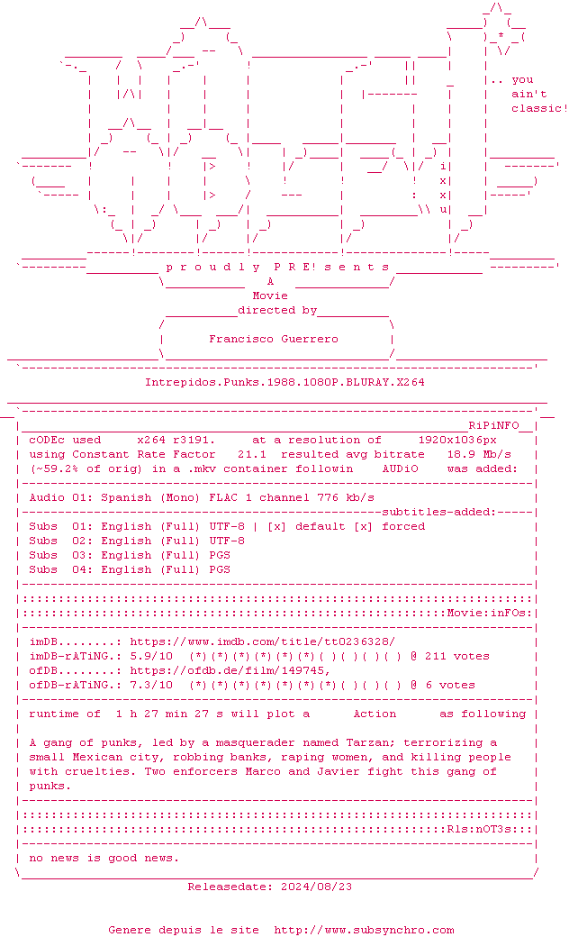 Voir le nfo de la release Intrepidos.Punks.1988.1080P.BLURAY.x264-WATCHABLE