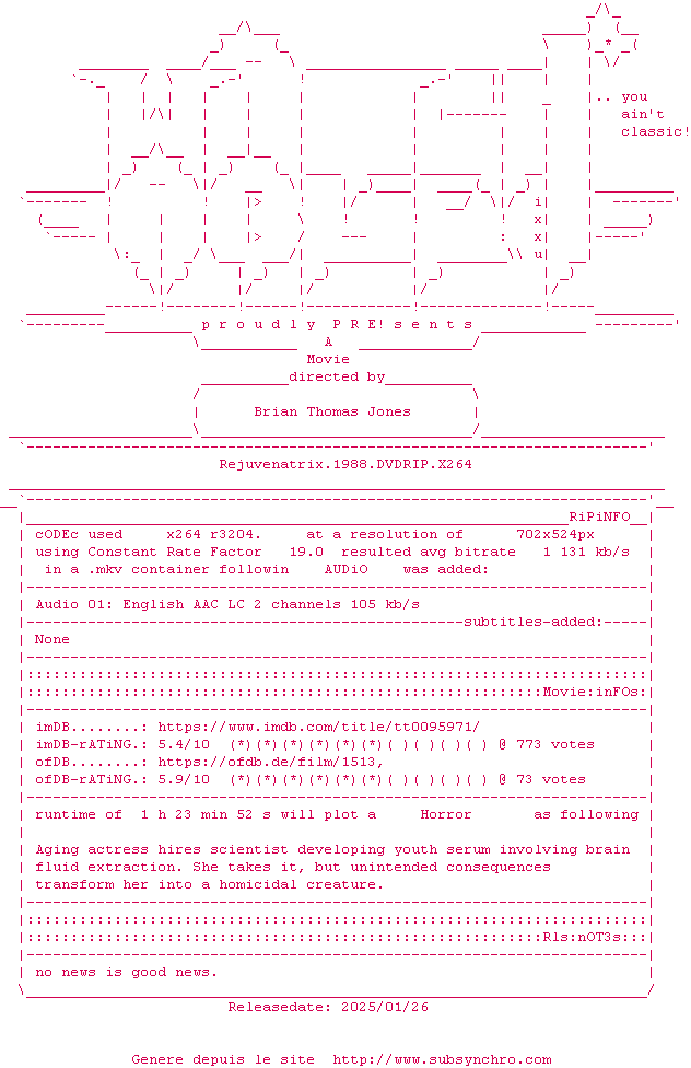 Voir le nfo de la release Rejuvenatrix.1988.DVDRIP.x264-WATCHABLE