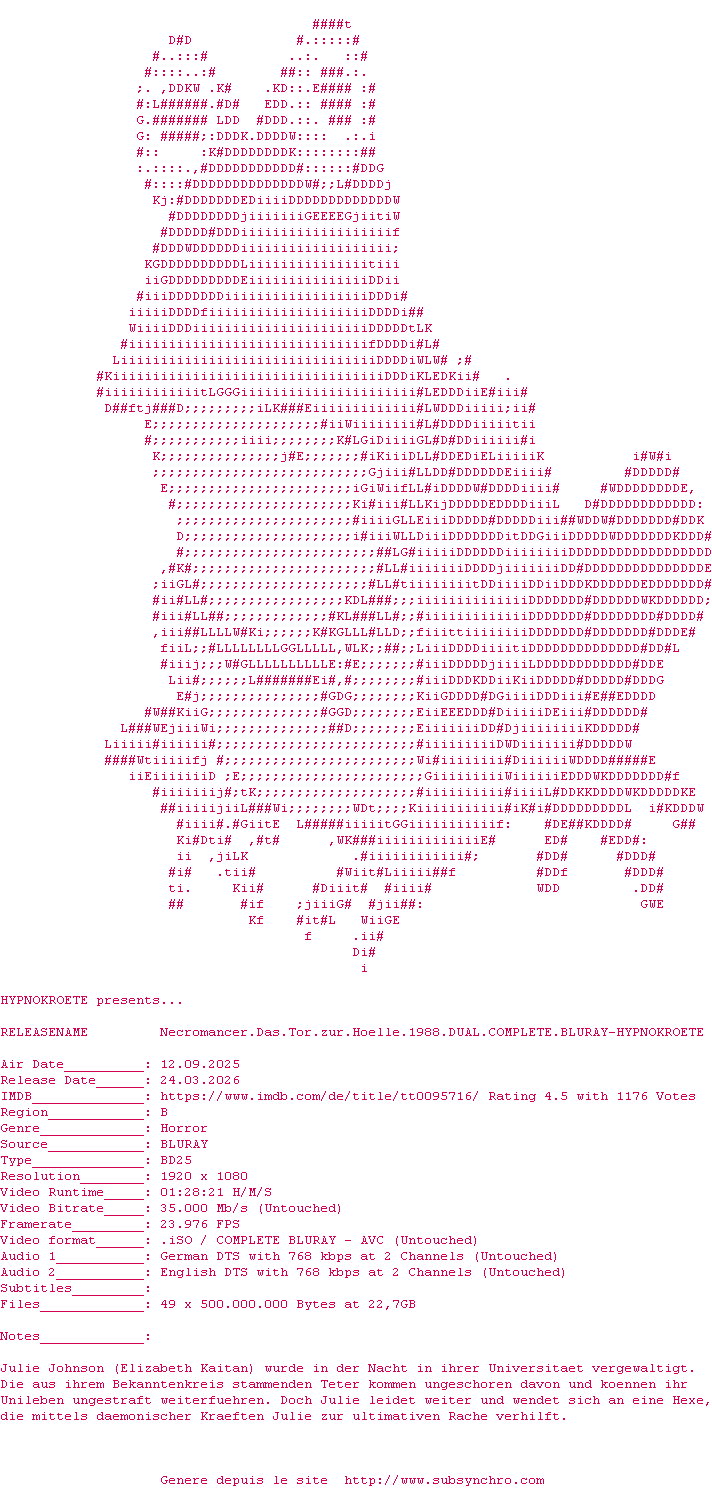 | Voir le nfo de la release Necromancer.Das.Tor.Zur.Hoelle.1988.DUAL.COMPLETE.BLURAY-HYPNOKROETE | HYPNOKROETE | Necromancer.Das.Tor.Zur.Hoelle.1988.DUAL.COMPLETE.BLURAY-HYPNOKROETE OpenSubtitles | 0 fichier | ||