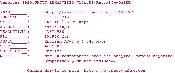 Voir le nfo de la release Vampires.1998.UNCUT.REMASTERED.1080p.BluRay.x264-GAZER