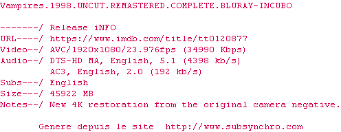 Voir le nfo de la release Vampires.1998.UNCUT.REMASTERED.COMPLETE.BLURAY-INCUBO