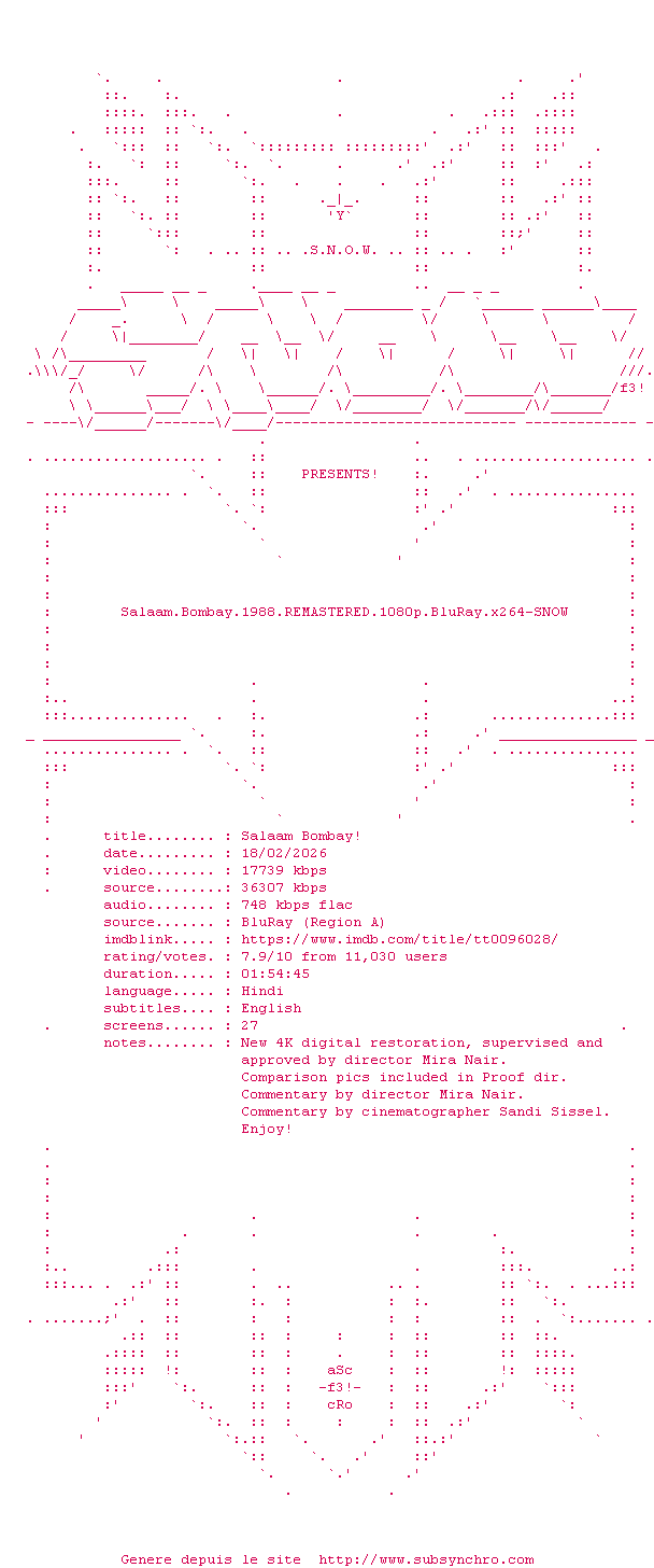 Y avez-vous pense ? Nous proposons déjà 1 sous-titre pour le film Salaam Bombay!. Avez-vous essaye de voir si ces sous-titres etaient compatibles avec cette release ? On vous laisse le soin de tester cela pour nous et de contribuer au site en postant le sous-titre en cas de compatiblite constatee !