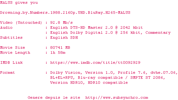 La release Drowning.By.Numbers.1988.2160p.UHD.BluRay.H265-MALUS est en 4K