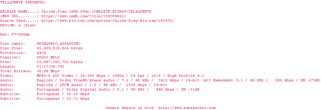 Voir le nfo de la release Childs.Play.1988.DUAL.COMPLETE.BLURAY-TELAQUENTE