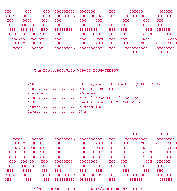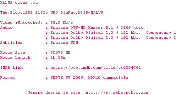 Le commentaire de CyberZip Commente par CyberZip (46), Le Dimanche 03 Novembre 2013 à 16h27 Un bon film d'horreur comme on savait en réaliser dans les 80's. Le scénario est assez original et le film pas mal gore pour l'époque. Un must have à revoir. Pour la petite histoire, "Thr blob" est le remake du film du même nom des années 60 avec un Steeve Mc Queen tout jeunet, mais l'original est bien moins flippant. 8 / 10 1 0