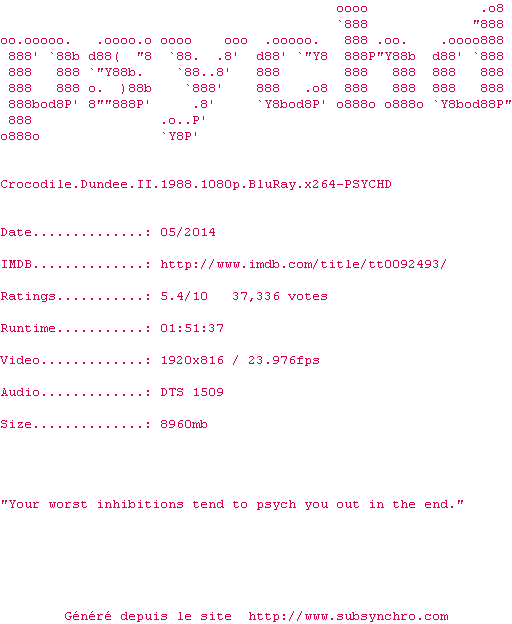 Voir le nfo de la release Crocodile.Dundee.II.1988.1080p.BluRay.x264-PSYCHD
