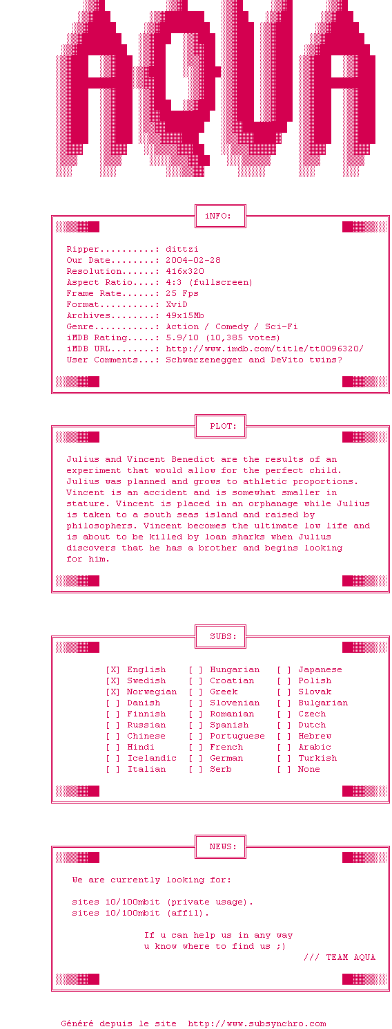 Y avez-vous pense ? Nous proposons déjà 2 sous-titres pour le film Jumeaux. Avez-vous essaye de voir si ces sous-titres etaient compatibles avec cette release ? On vous laisse le soin de tester cela pour nous et de contribuer au site en postant le sous-titre en cas de compatiblite constatee !