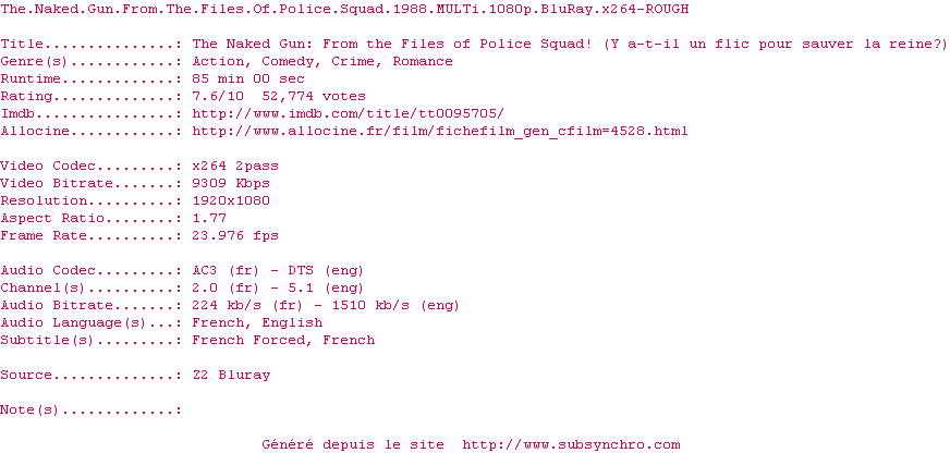 Commentez le fichier The.Naked.Gun.From.The.Files.Of.Police.Squad.1988.MULTi.1080p.BluRay.x264-ROUGH.srt