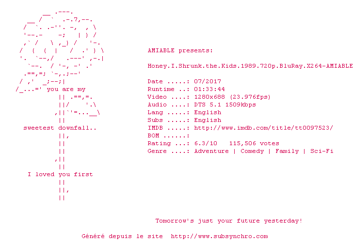 Voir le nfo de la release Honey.I.Shrunk.The.Kids.1989.1080p.BluRay.x264-AMIABLE