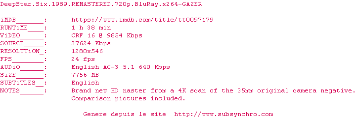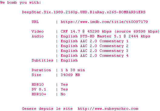 Voir le nfo de la release DeepStar.Six.1989.2160p.UHD.BluRay.H265-MALUS