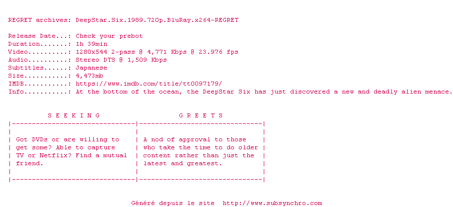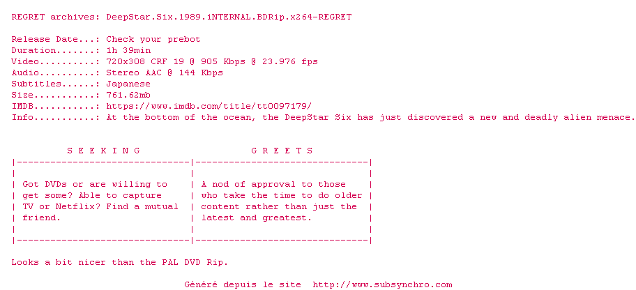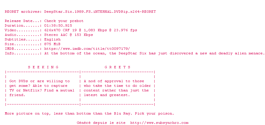 Voir le nfo de la release DeepStar.Six.1989.FS.iNTERNAL.DVDRip.x264-REGRET