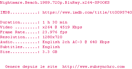 Voir le nfo de la release Nightmare.Beach.1989.720p.BluRay.x264-SPOOKS