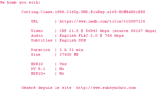 Voir le nfo de la release Cutting.Class.1989.2160p.UHD.BluRay.x265-B0MBARDiERS