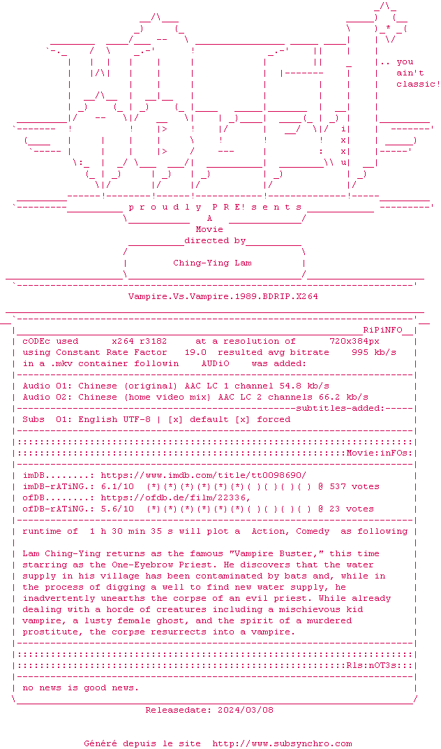 Voir le nfo de la release Vampire.Vs.Vampire.1989.BDRIP.x264-WATCHABLE