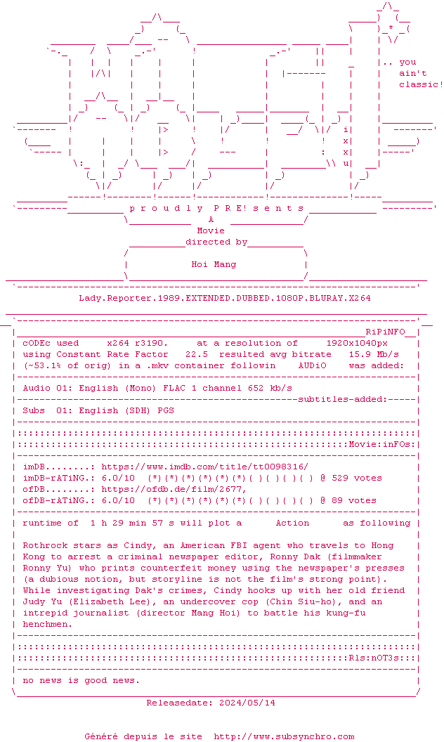 Voir le nfo de la release Lady.Reporter.1989.EXTENDED.DUBBED.1080P.BLURAY.x264-WATCHABLE