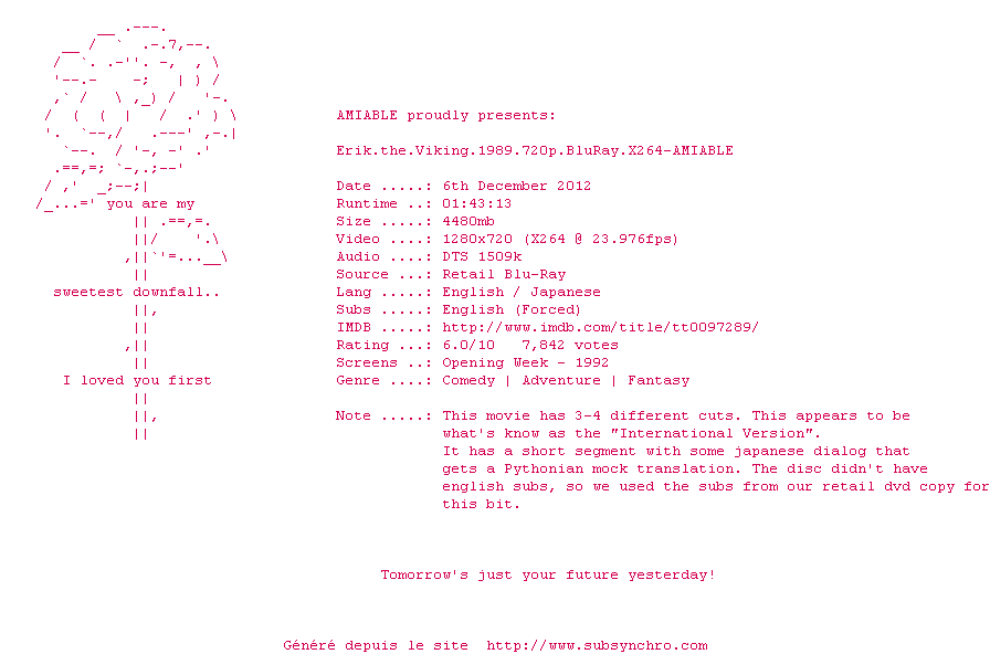 Voir le nfo de la release Erik.The.Viking.1989.720p.BluRay.x264-AMIABLE