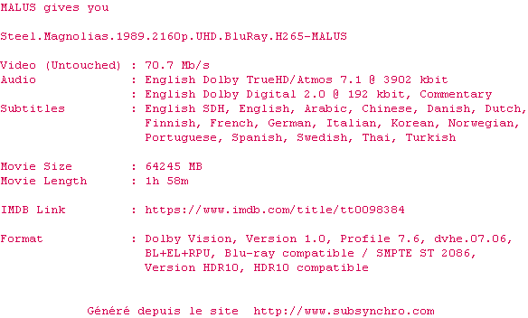 Voir le nfo de la release Steel.Magnolias.1989.2160p.UHD.BluRay.H265-MALUS