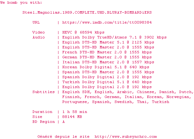 Voir le nfo de la release Steel.Magnolias.1989.COMPLETE.UHD.BLURAY-B0MBARDiERS