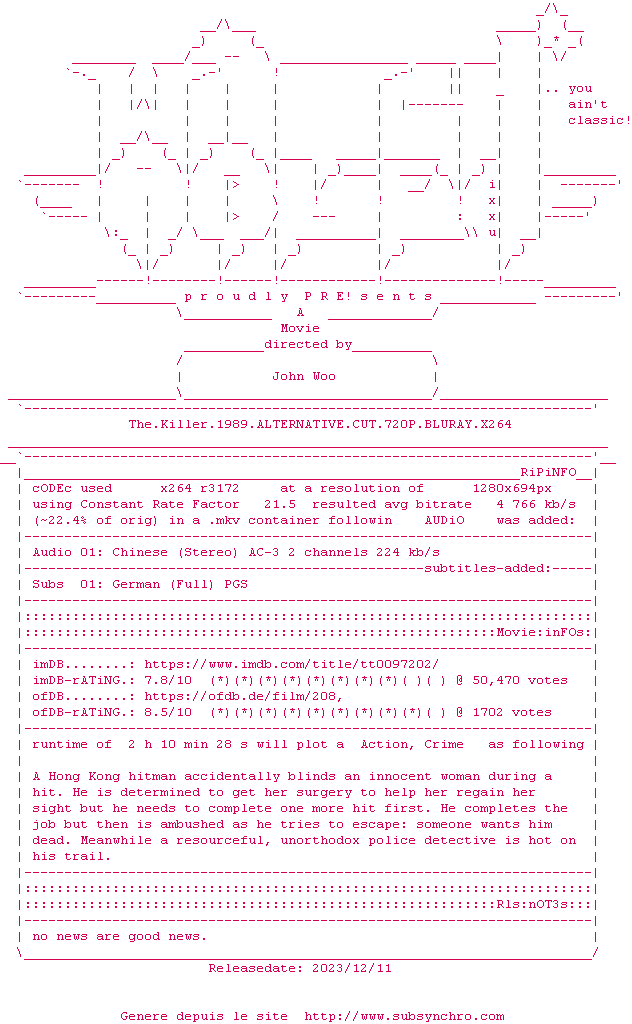 Voir le nfo de la release The.Killer.1989.ALTERNATIVE.CUT.720P.BLURAY.x264-WATCHABLE