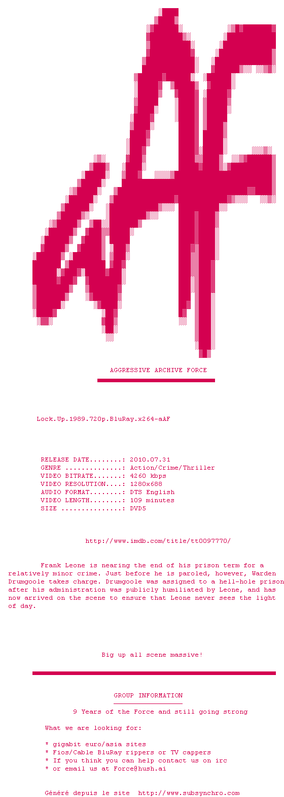 Voir le nfo de la release Lock.Up.1989.720p.BluRay.x264-aAF