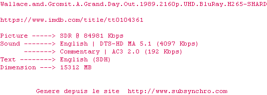 Voir le nfo de la release Wallace.And.Gromit.A.Grand.Day.Out.1989.2160p.UHD.BluRay.H265-SHARD