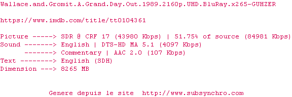 Voir le nfo de la release Wallace.And.Gromit.A.Grand.Day.Out.1989.2160p.UHD.BluRay.x265-GUHZER