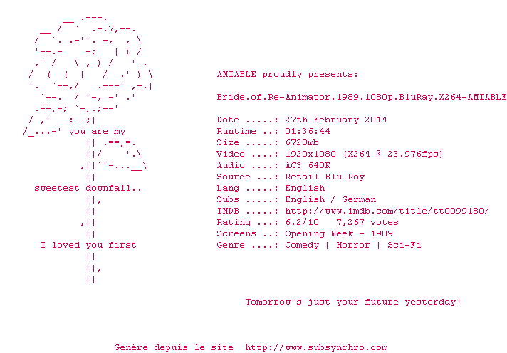 Telechargez le RSS « Fichier de la release Bride.Of.Re-Animator.1989.1080p.BluRay.x264-AMIABLE »