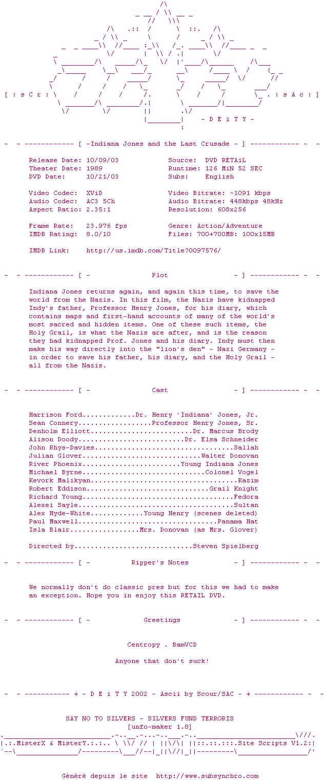 Indiana.Jones.And.The.Last.Crusade.DVDRiP.XViD-DEiTY.zip Ajouté par XeiS Ajoute le 27-03-2010 00:10:18 Format : ZIP Italique : Non Taille : 0.00Ko Telechargement : 98 Le fichier 52-1269645018.zip n'existe pas ! Ajouter cette release à ma collection en cas de telechargement des sous-titres 0 0 0 Telecharger le ZiP contenant NFO, Affiche, Sous-titre (*.zip) Commentez le fichier Indiana.Jones.And.The.Last.Crusade.DVDRiP.XViD-DEiTY.zip Commentez le fichier Indiana.Jones.And.The.Last.Crusade.DVDRiP.XViD-DEiTY.zip Commentez ce fichier Le fichier 52-1269645018.zip n'existe pas ! Telechargez le RSS « Fichier de la release Indiana.Jones.And.The.Last.Crusade.DVDRiP.XViD-DEiTY » Retour au film « Indiana Jones et la Dernière Croisade »