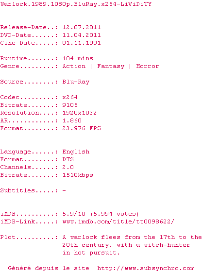 Extrait de la release Warlock.1989.MULTi.1080p.BluRay.x264-TRUEDUKES.