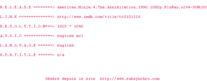Voir le nfo de la release American.Ninja.4.The.Annihilation.1990.720p.BluRay.x264-SONiDO