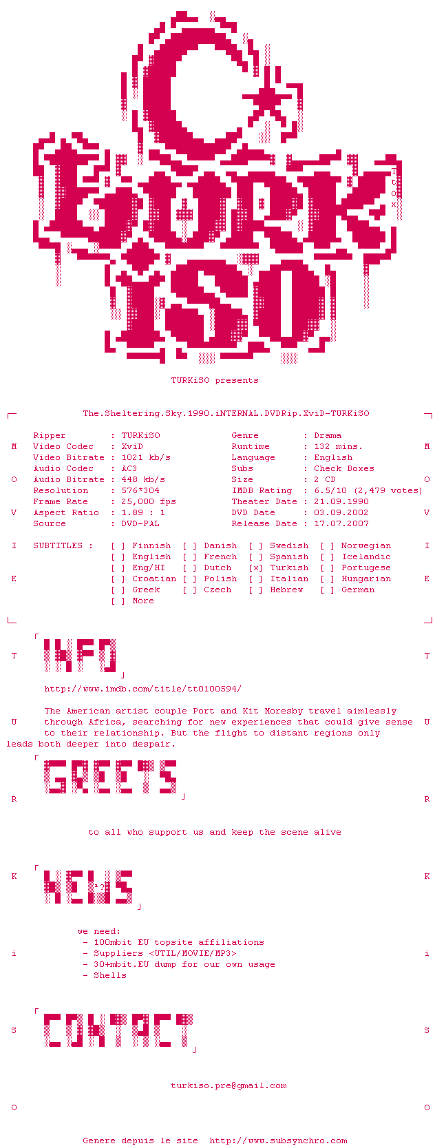 Voir le nfo de la release The.Sheltering.Sky.1990.iNTERNAL.DVDRip.XviD-TURKiSO