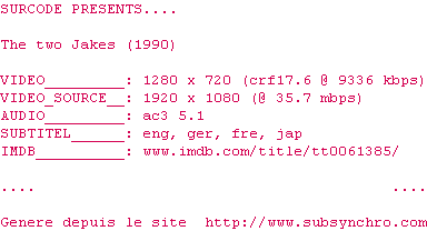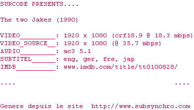 Voir le nfo de la release The.Two.Jakes.1990.1080p.BluRay.x264-SURCODE