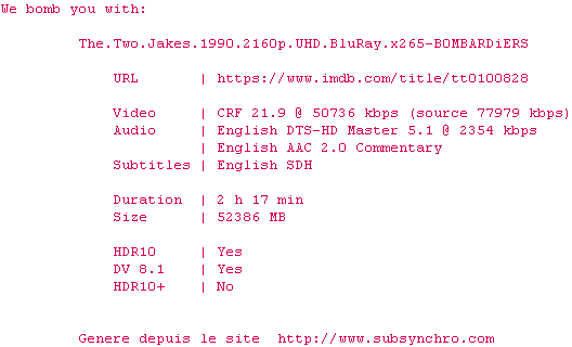 Voir le nfo de la release The.Two.Jakes.1990.2160p.UHD.BluRay.H265-MALUS