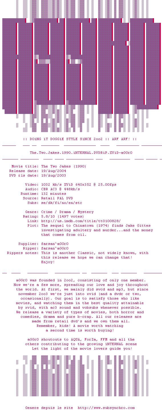 Voir le nfo de la release The.Two.Jakes.1990.iNTERNAL.DVDRiP.XViD-aGGr0