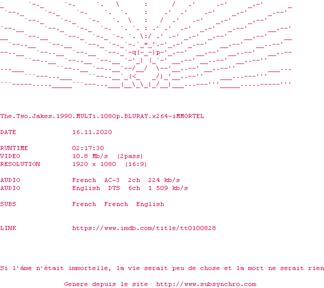 Voir le nfo de la release The.Two.Jakes.1990.MULTi.1080p.BLURAY.x264-iMMORTEL