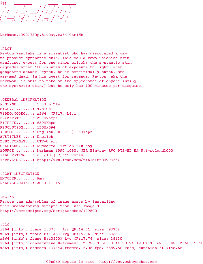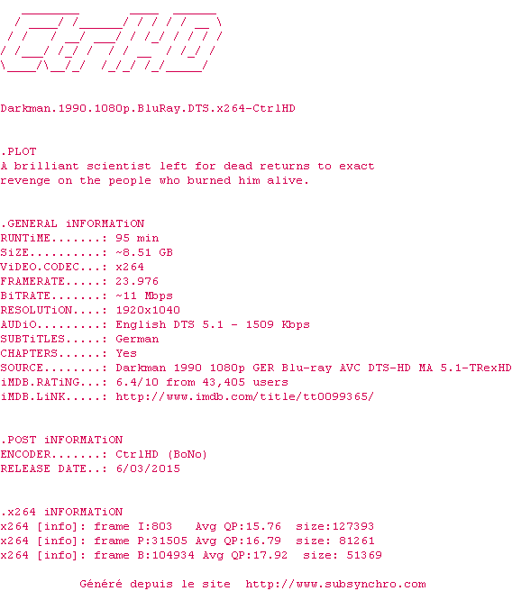Voir le nfo de la release Darkman.1990.1080p.BluRay.DTS.x264-CtrlHD