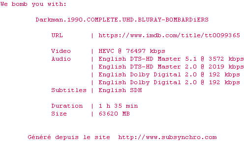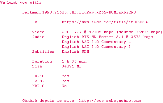 Voir le nfo de la release Darkman.1990.2160p.UHD.BluRay.H265-MALUS