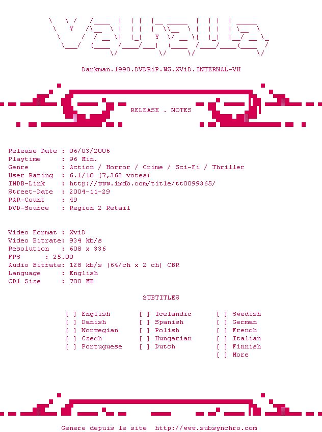 Voir le nfo de la release Darkman.1990.DVDRip.WS.XviD.iNTERNAL-VH