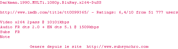 Voir le nfo de la release Darkman.1990.MULTi.1080p.BluRay.x264-DuSS