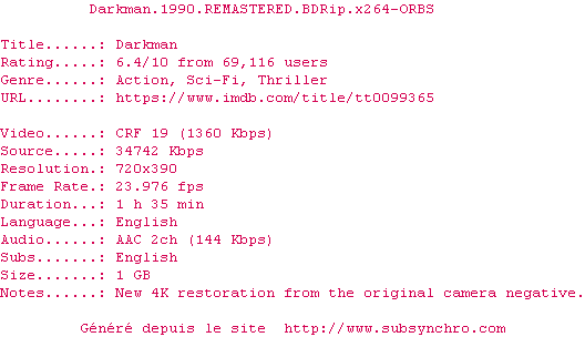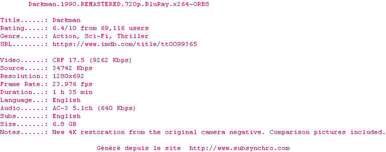 Voir le nfo de la release Darkman.1990.REMASTERED.720p.BluRay.x264-ORBS