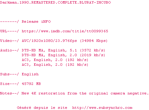 Voir le nfo de la release Darkman.1990.REMASTERED.COMPLETE.BLURAY-INCUBO