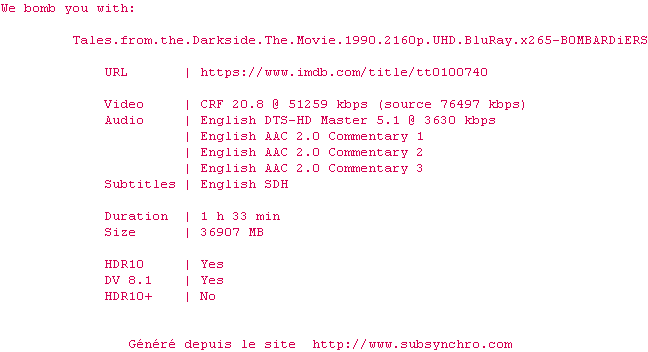Voir le nfo de la release Tales.From.The.Darkside.The.Movie.1990.2160p.UHD.BluRay.x265-B0MBARDiERS
