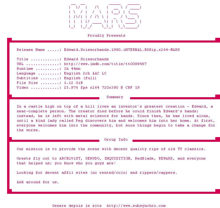 Voir le nfo de la release Edward.Scissorhands.1990.iNTERNAL.BDRip.x264-MARS