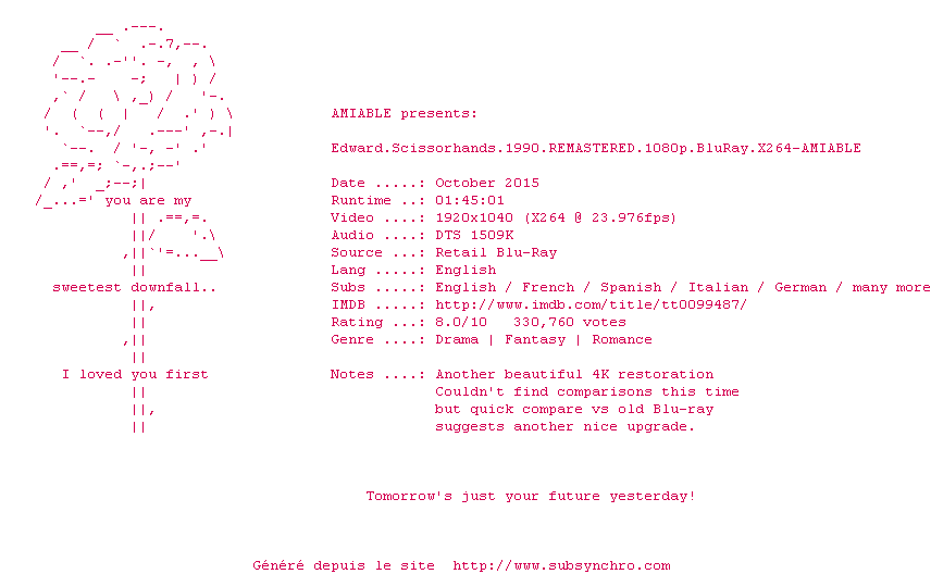 Voir le nfo de la release Edward.Scissorhands.1990.REMASTERED.1080p.BluRay.x264-AMIABLE