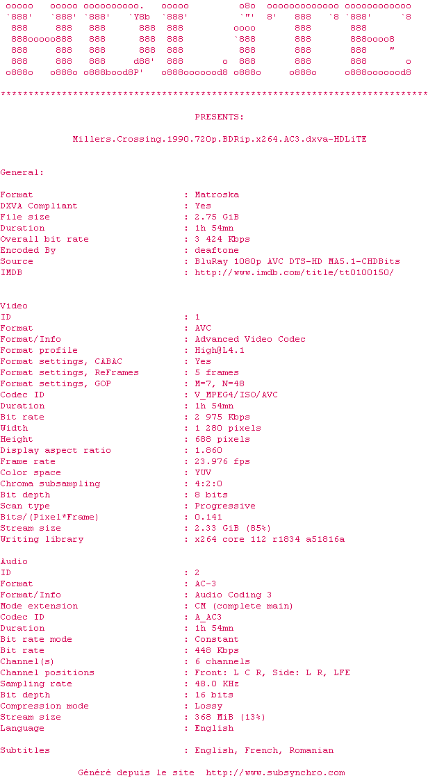 Voir le nfo de la release Millers.Crossing.1990.BluRay.720p.DTS.X264-CHD
