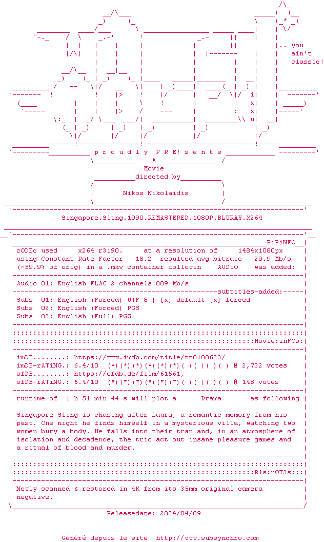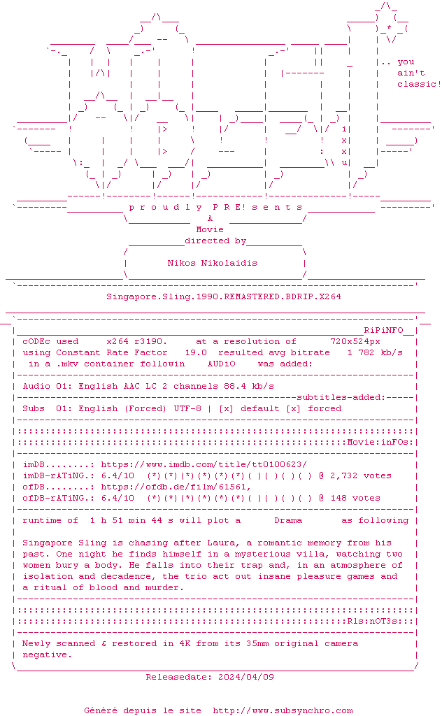 Voir le nfo de la release Singapore.Sling.1990.REMASTERED.BDRIP.x264-WATCHABLE