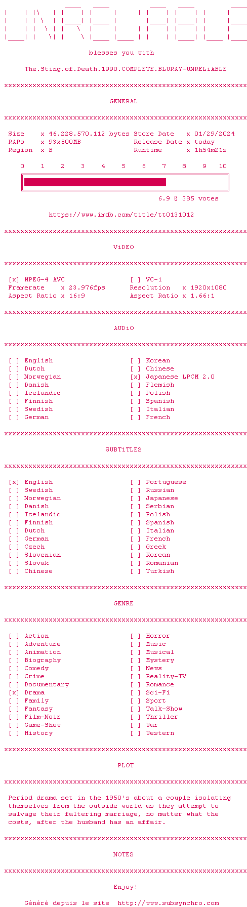 Voir le nfo de la release The.Sting.Of.Death.1990.COMPLETE.BLURAY-UNRELiABLE