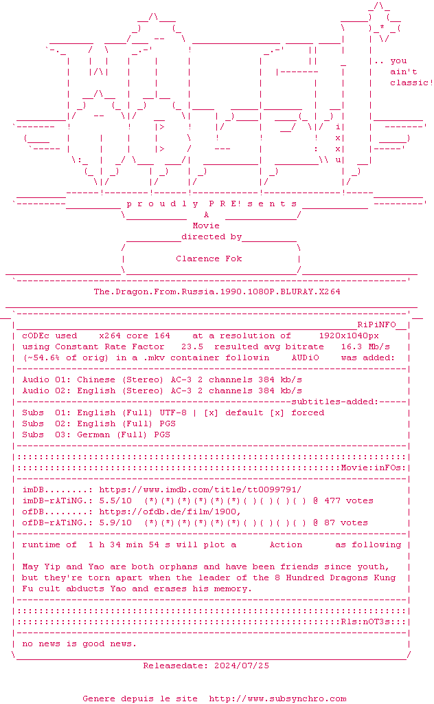Voir le nfo de la release The.Dragon.From.Russia.1990.1080P.BLURAY.x264-WATCHABLE