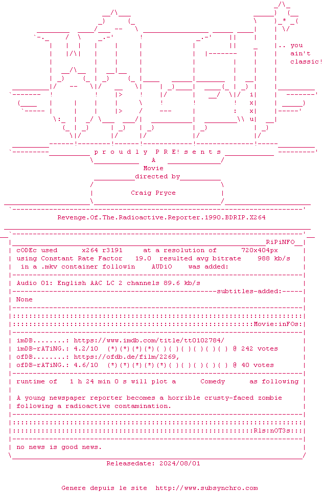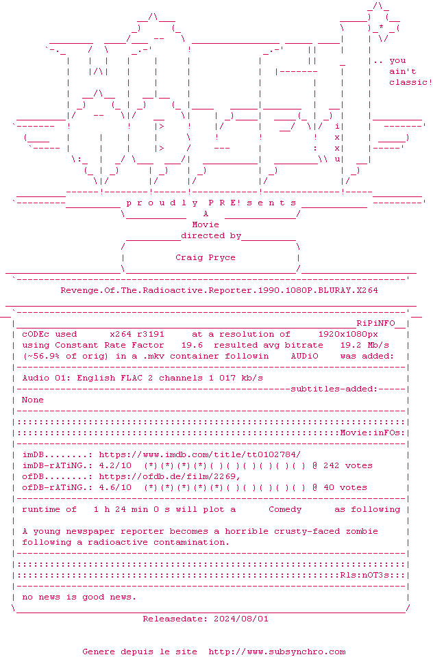 Voir le nfo de la release Revenge.Of.The.Radioactive.Reporter.1990.1080P.BLURAY.x264-WATCHABLE