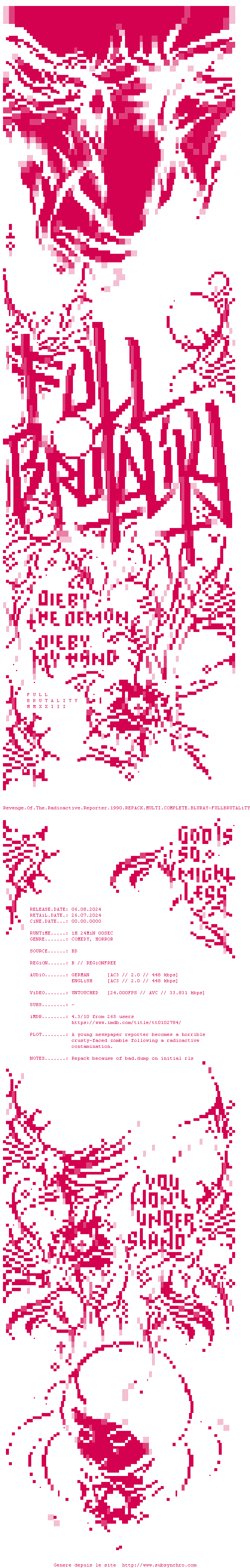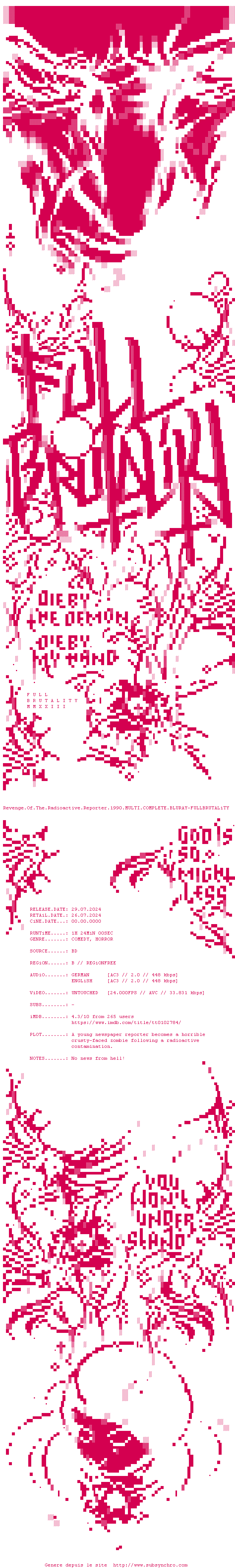 Voir le nfo de la release Revenge.Of.The.Radioactive.Reporter.1990.MULTI.COMPLETE.BLURAY-FULLBRUTALiTY